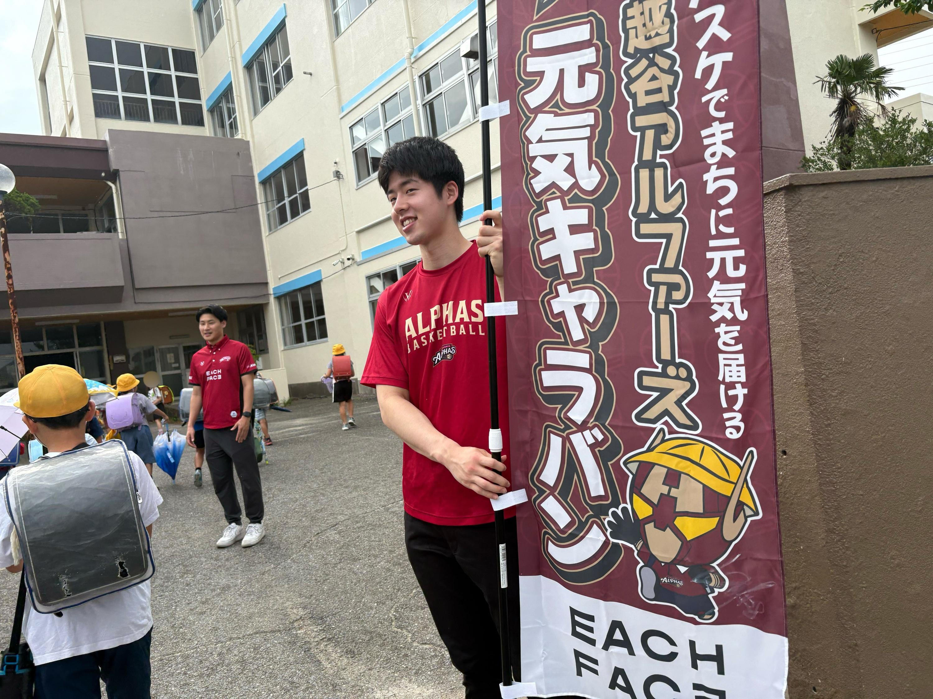 「越谷アルファーズ」の選手やクラブマスコット「アルファマン」が学校を訪問し、朝の登校時にあいさつ運動を行う活動です。